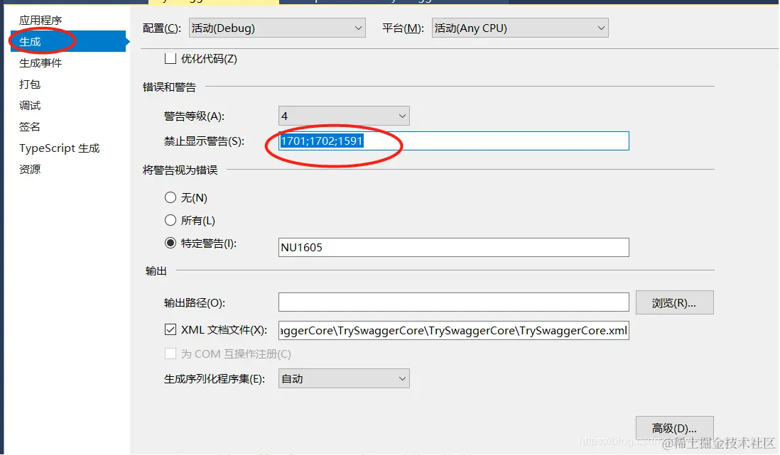 (3)如果大家会发现有了许多警告,强迫症患者看这里,我们只需要在生成中强制过滤1591的警告即可