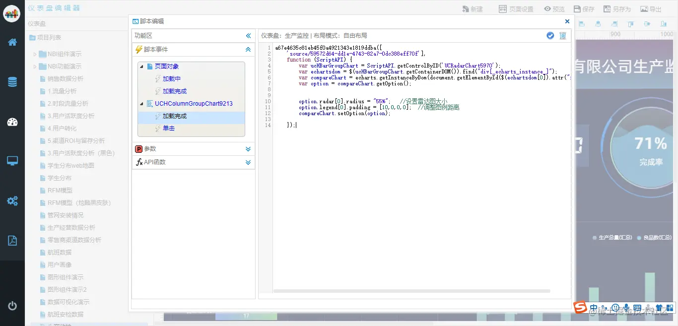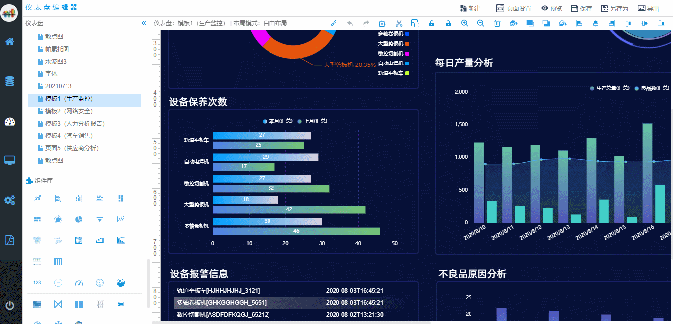 NBI可视化平台内置多种风格多套模板,做数据可视化不费劲 NBI可视化 2022-06-06 108 阅读1分钟 NBI可视化平台版本V4.9.1介绍,在NBI可视化平台V4.9.1版本中内置了多种风格、多套模板可以供用户选择使用,并且在可视化视觉上面做了增强 NBI具有丰富的数据源对接能力 易于操作的可视化编辑器 丰富的组件库: 易于功能扩展的脚本功能: NBI大数据 NBI可视化