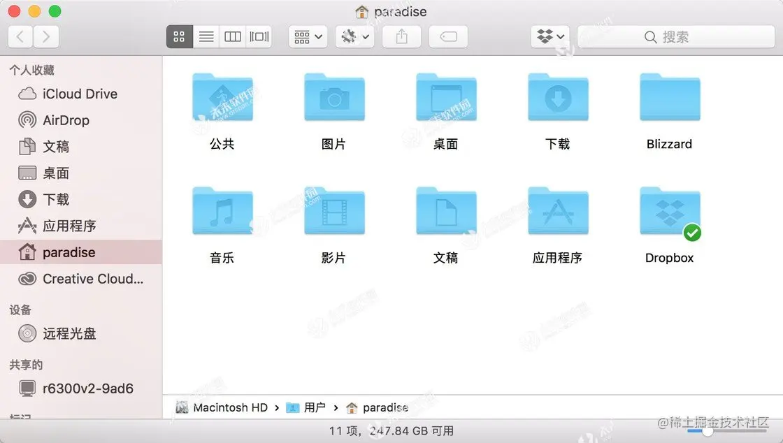 macOS 中的资源管理器是 Finder,由于沿用了 Unix 的文件系统,在 macOS 中并没有 C 盘,D 盘,而是用不同的文件夹来区分不同的用途。每个 macOS 的用户都会有一个自己的用户目录,里面一般包含公共、图片、下载、桌面、文稿等文件夹。你可以将文件分类存放在这些文件夹中,也可以自己建立新的文件夹来存放。