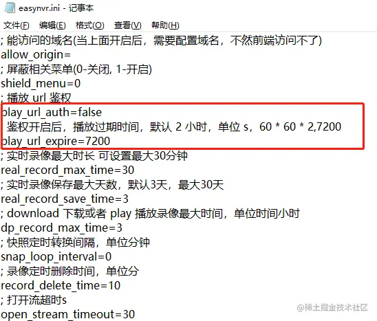EasyNVR平台在设计开发之初,已经考虑到此需求,对视频流的播放时长控制已经做过设计。我们可以在easynvr.ini配置文件里,找到play_url_auth,此处默认是关闭的状态。将值设置为true,即可打开流地址鉴权,并可以设置播放时长的权限,如图所示: