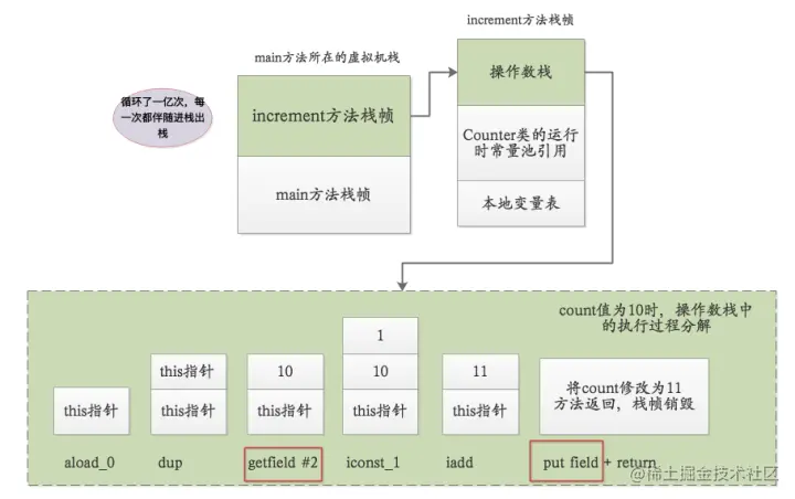 我们知道Java中方法的调用是基于栈帧实现的,每个栈帧中主要包含操作数栈+用到类的运行时常量池引用+本地变量表。我画了一张示意图帮助大家理解整个执行过程,并且将其中一次count++操作的字节码在操作数栈中的执行步骤分解了(以count=10为例),这里要注意,下面这张图的运行是在工作内存中(main方法所在线程的虚拟机栈中)。