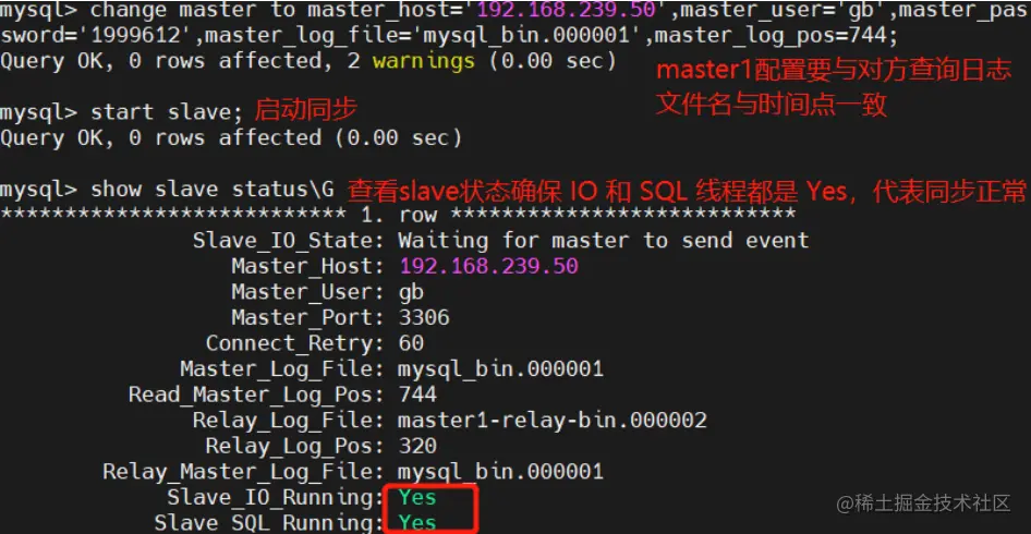 change master to master_host='192.168.239.50',master_user='gb',master_password='1999612',master_log_file='mysql_bin.000001',master_log_pos=744;