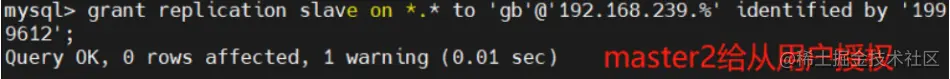 grant replication slave on *.* to 'gb'@'192.168.239.%' identified by '1999612';