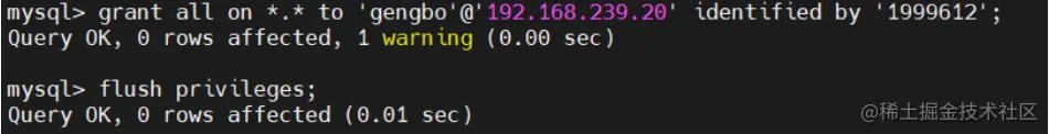 grant all on *.* to 'gengbo'@'192.168.239.20' identified by '1999612';