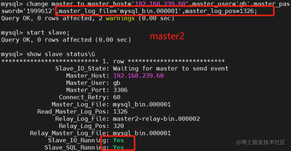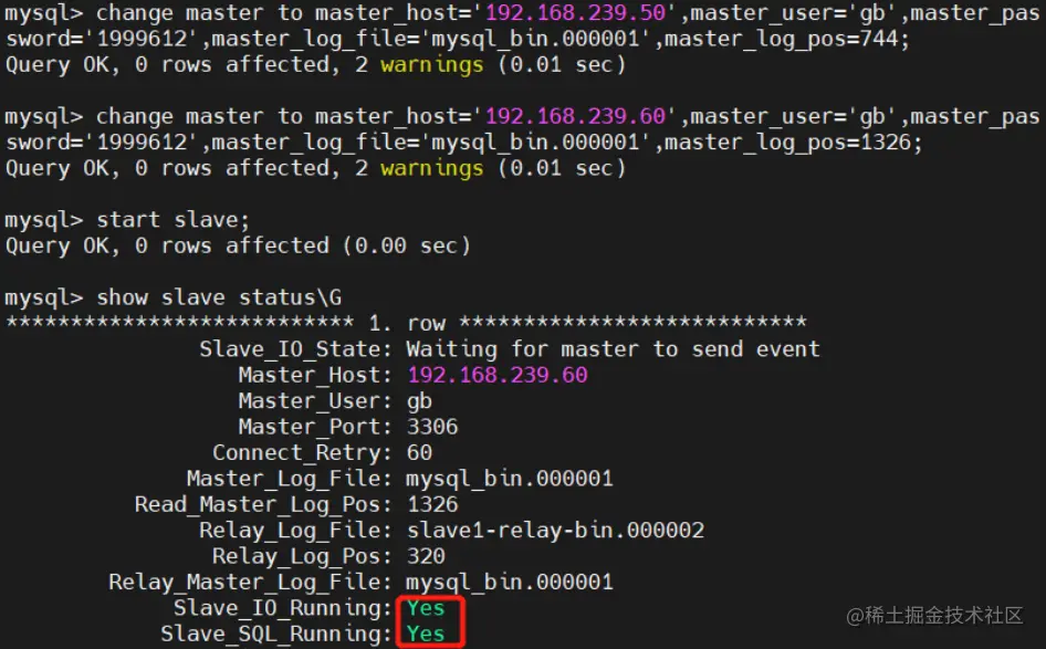 change master to master_host='192.168.239.60',master_user='gb',master_password='1999612',master_log_file='mysql_bin.000001',master_log_pos=1326;