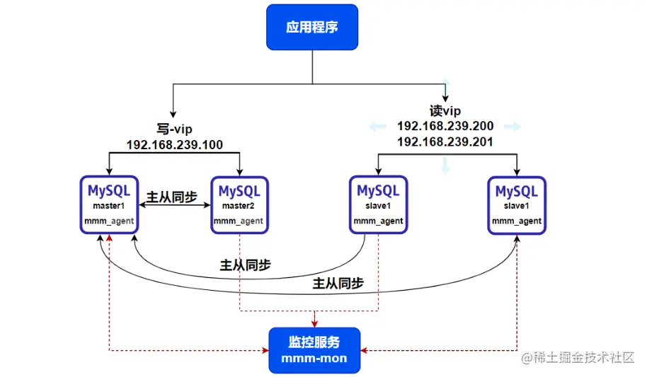 ●mysql-mmm 的监管端会提供多个虚拟 IP(VIP),包括一个可写 VIP,多个可读 VIP,通过监管的管理,这些 IP 会绑定在可用 MySQL 之上,当某一台 MySQL 宕机时,监管会将 VIP 迁移至其他 MySQL。