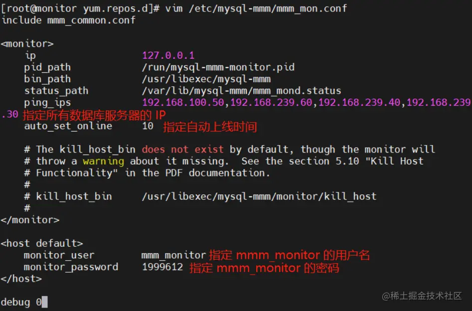 在 monitor 监控服务器上修改监控配置文件mmm_mon.conf