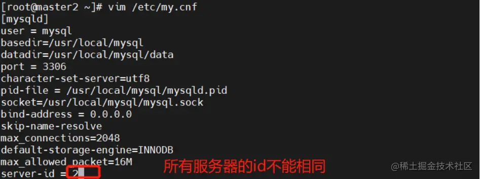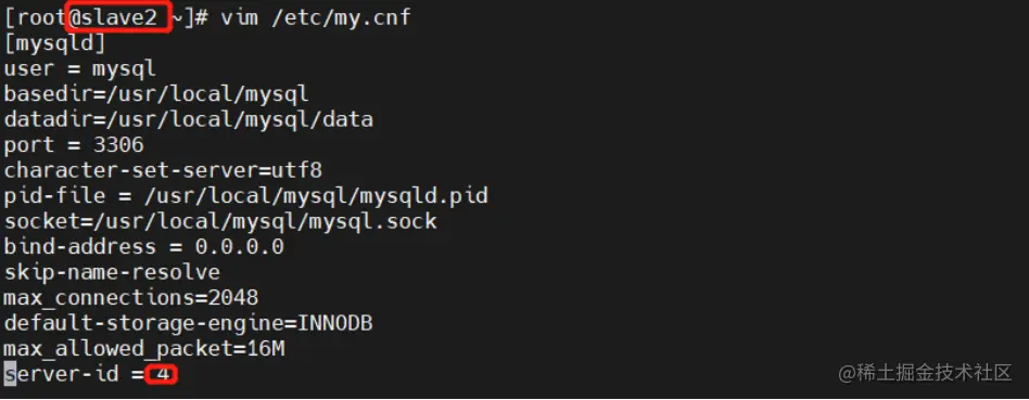#把配置文件复制到其它 3 台数据库服务器上并启动服务器,注意:配置文件中的 server_id 要修改