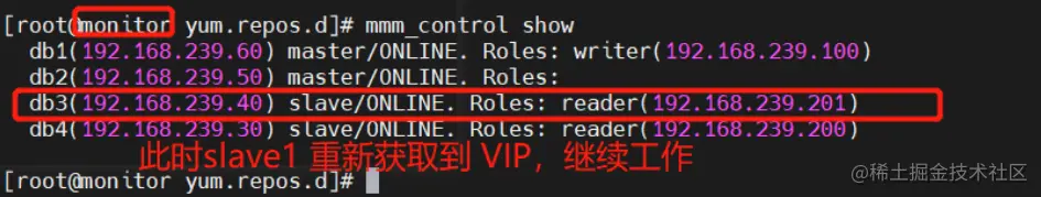 停止 slave1 的 mysql 服务查看 VIP 漂移情况