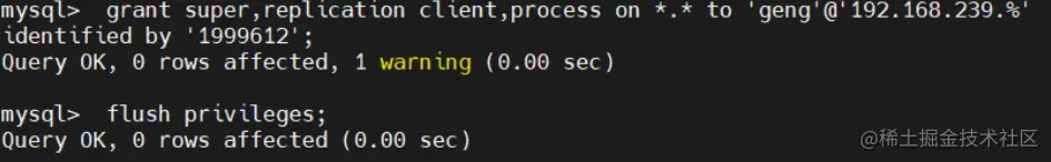 grant super,replication client,process on *.* to 'geng'@'192.168.239.%' identified by '1999612';