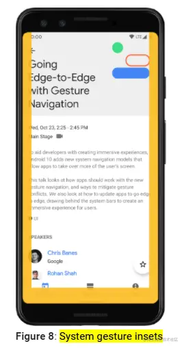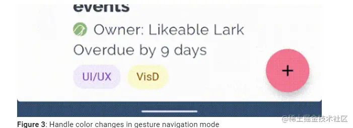 当操作在一个边缘到边缘的布局,你的应用程序需要改变导航和状态栏的颜色,以允许下面的内容是可见的,应用程序执行此步骤后, 系统将处理手势导航模式或按钮模式下所有用户界面的视觉保护。