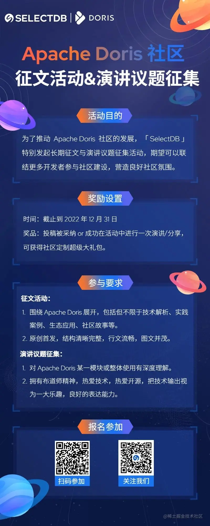 为了推动 Apache Doris 社区的发展,「SelectDB」特别发起长期征文与演讲议题征集活动,期望可以联结更多开发者共建社区,致力于营造充满技术交流、经验分享、实践探索的良好社区氛围!