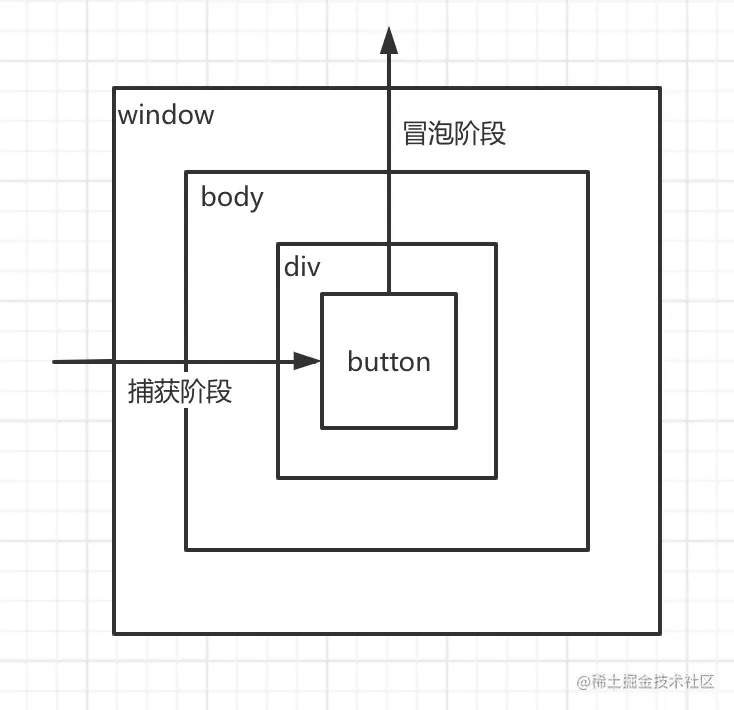 - 捕获阶段, 从window对象开始, 查看哪个元素绑定了该事件