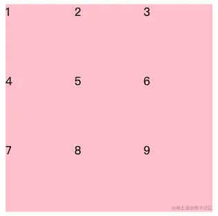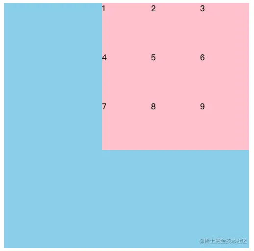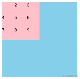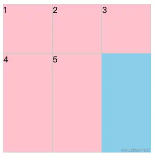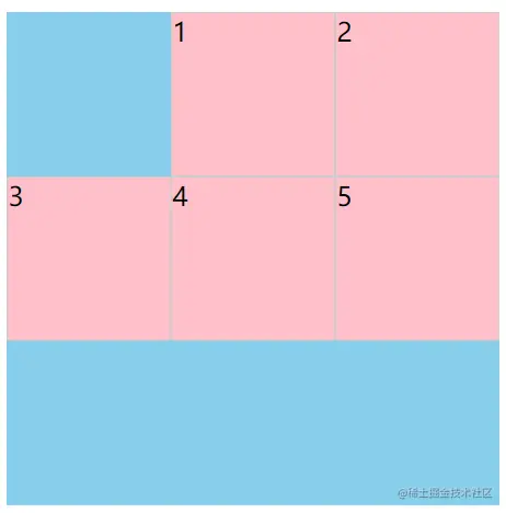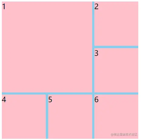 - 将网格布局为3行3列,然后将第一个子元素所占区域设置为从第一个网格线开始横跨2行2列即可实现此效果