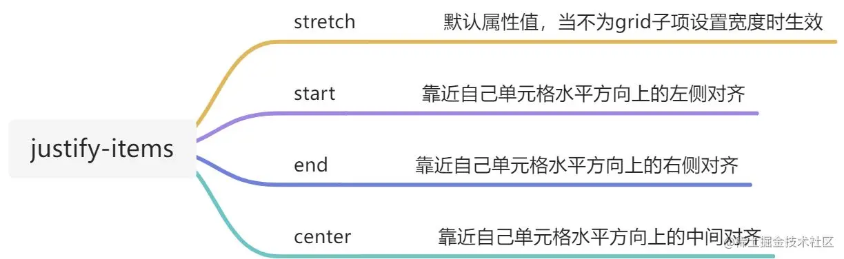 - 设置为同一个区域后可通过justify-self与align-self去调整元素的位置