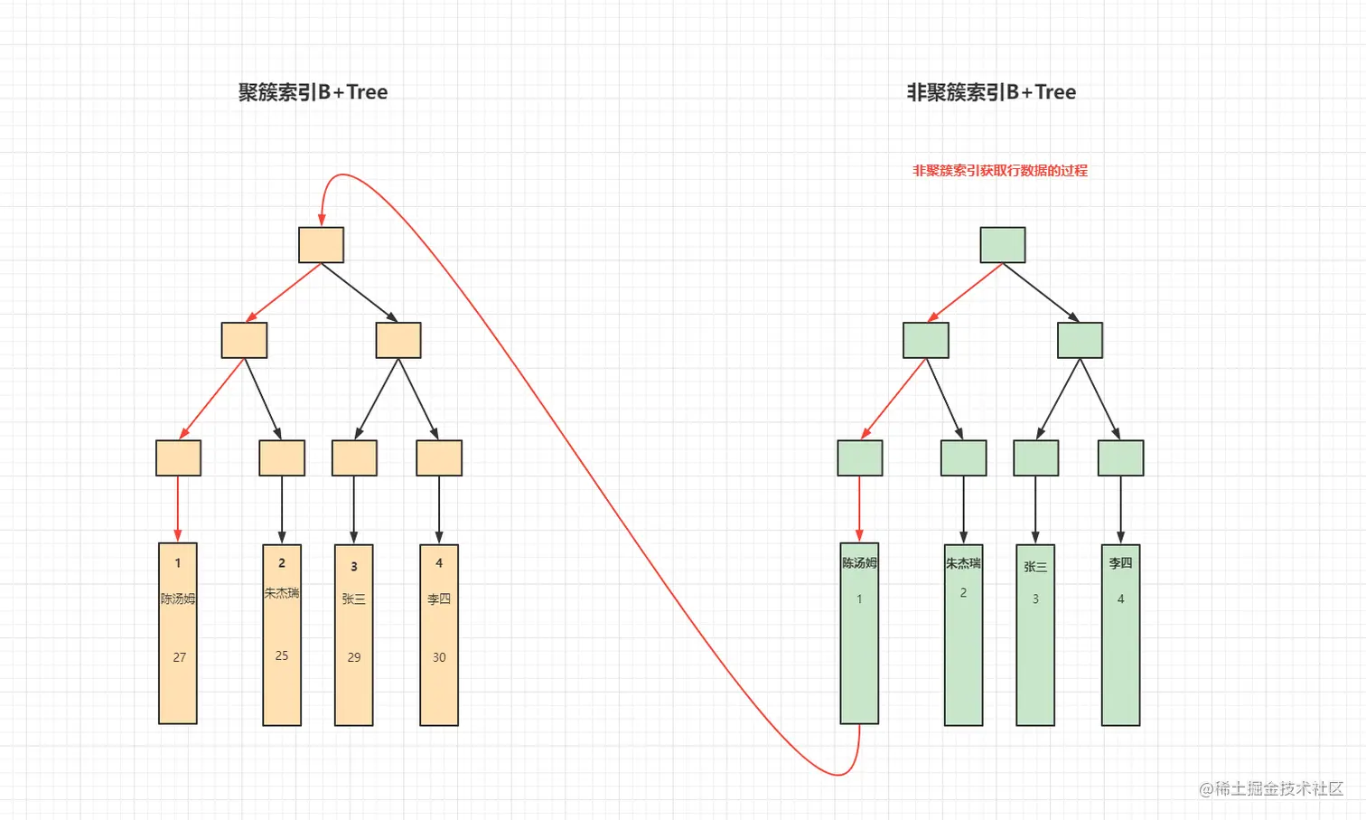 一句话解释:非聚簇索引则相反,需要先确定主键索引后,再通过主键索引确定数据。