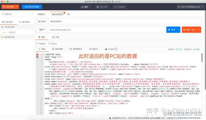 它同样支持局域网接口的发送调试。 ApiPost模拟手机请求: 我们以访问搜狗网为例 1、打开ApiPost客户端,接口地址输入:www.sogou.com 然后点击发送,我们可以看到数据返回是PC的内容。\