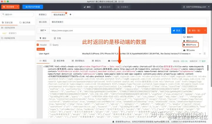 其实,ApiPost模拟移动端的原理很简单,就是伪造user-Agent头。通过这个功能,您不仅可以模拟移动端,甚至可以模拟移动设备的型号等。