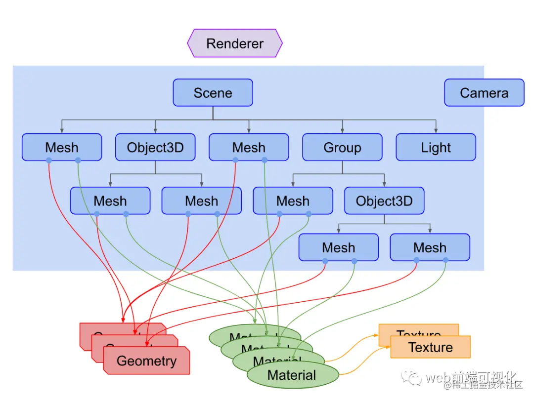 网格对象(Mesh): 网格对象由几何体(Geometry) 和材质(Material) 两部分组成,Geometry 负责几何模型,Material 负责外观样式。我们加载的模型可以看成一个组(Group) ,一个复杂的模型是由多个网格组合而成的,每个网格对象则相当于汽车的独立零件。