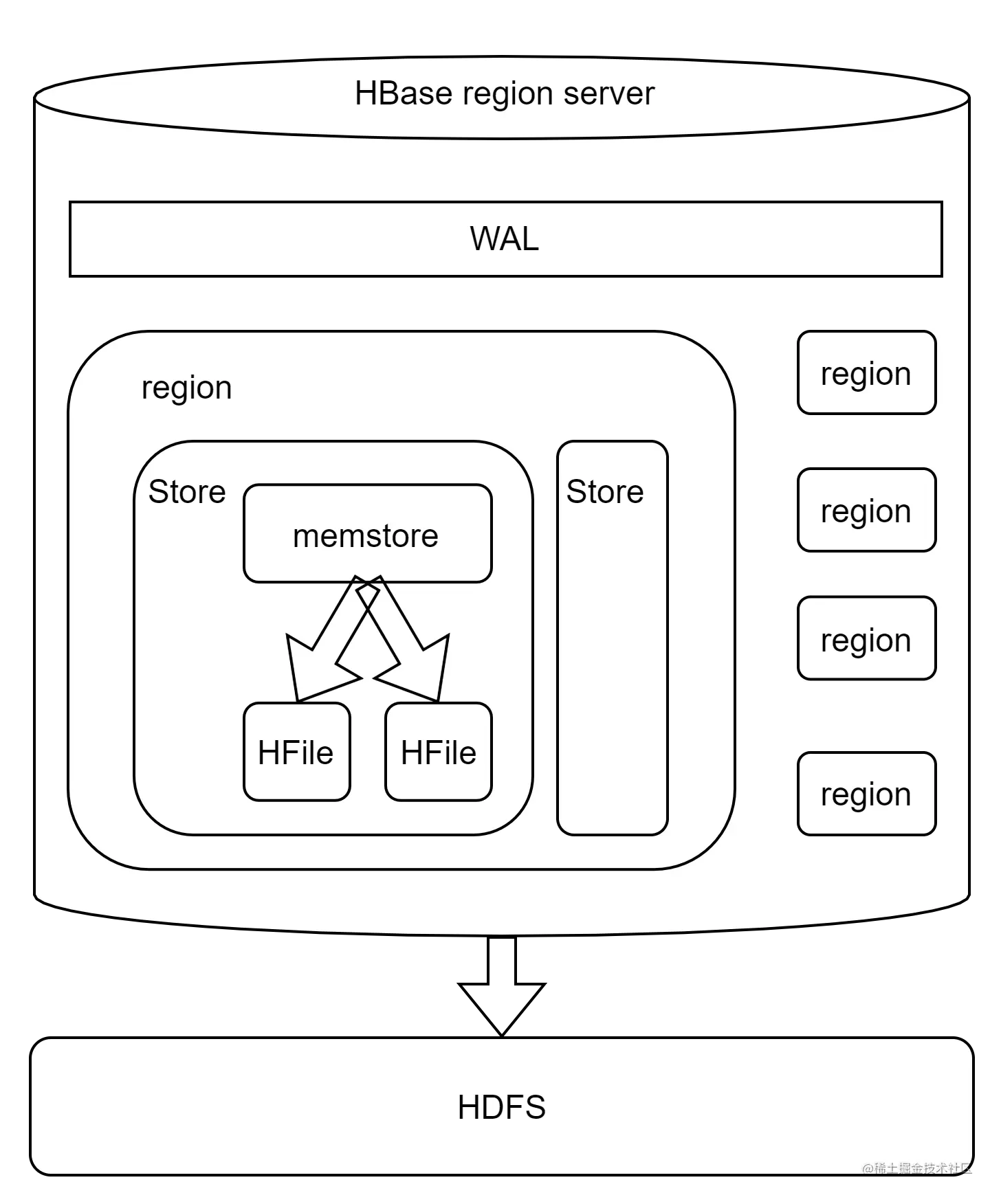 - store:一个列族对应一个store,因此为了提高性能,不建议使用超过2个列族。一个store包含一个memstore和多个HFile