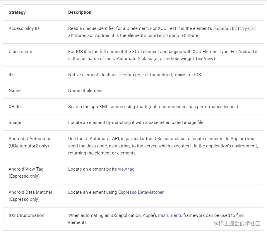 定位页面的元素有很多方式,比如可以通过 ID、accessibility_id、XPath 等方式进行元素定位,还可以使用 Android、iOS 工作引擎里面提供的定位方式。
