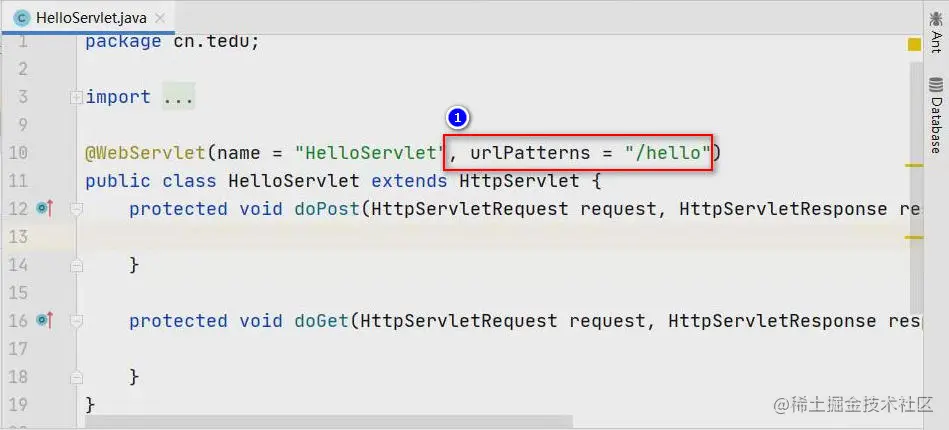 创建成功后,会自动打开所创建的Servlet类,首先,在@WebServlet注解参数中,增加配置urlPatterns属性,以指定访问该Servlet组件的资源名(注意:该属性值需要使用 / 作为第1个字符):