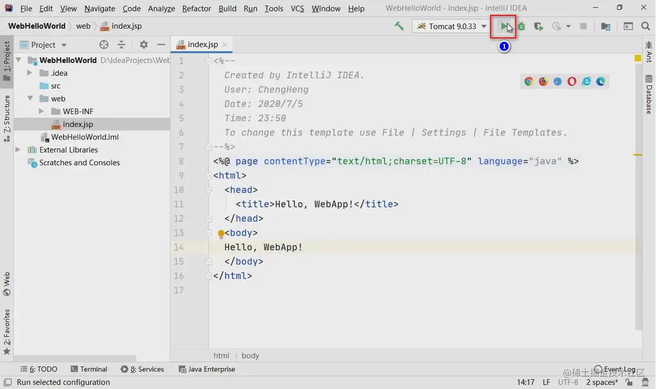 点击窗口右上角的“运行”按钮,即可将当前项目部署到Tomcat并运行:
