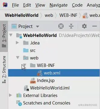 相比普通的Java项目,在Java EE项目结构中多了一个web文件夹,相当于使用Eclipse时在项目中看到的webapp文件夹,在web文件夹下有WEB-INF子文件夹和index.jsp文件,并且,在WEB-INF文件夹下还有web.xml文件: