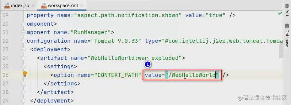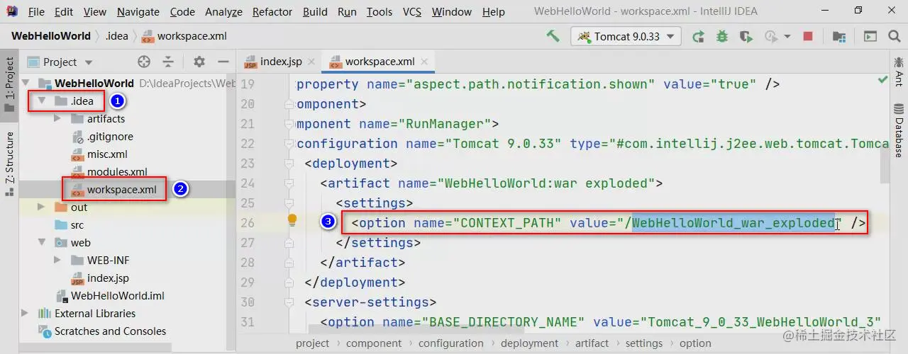 如果需要修改项目的Context Path,展开项目结构中的.idea,打开workspace.xml文件,在该文件的第26行(因版本差异可能行号不同)就是Context Path值的配置: