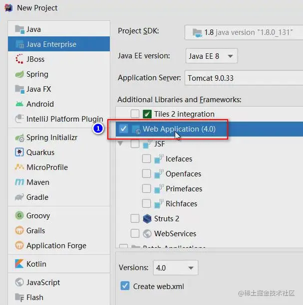 回到New Project对话框,在Additional Libraries and Frameworks的列表中,勾选Web Application (4.0),然后点击Next到下一步: