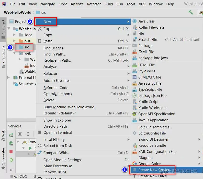 在Java EE项目中,使用Servlet组件转发JSP是非常常见的做法,首先,对项目的src点击鼠标右键,依赖选择New > Create New Servlet即可开始创建Servlet组件: