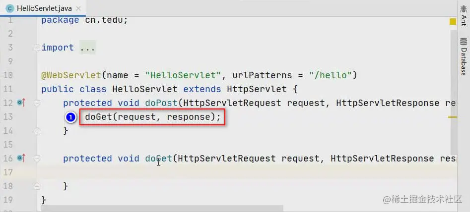 默认情况下,当前Servlet中已经生成了重写的doPost与doGet方法,由于本次只是简单的访问即可,客户端提交请求的方式应该是GET类型,则不需要doPost方法,删掉即可,如果允许使用POST方式访问,且与GET方式相同的处理模式,则在doPost方法中直接调用doGet方法即可: