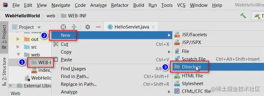在实现转发时,需要一个JSP页面文件,通常,会将JSP文件保存到WEB-INF的某个子级文件夹中,避免JSP文件被直接访问!对WEB-INF文件夹点击鼠标右键,依次选择New > Directory以创建用于存放JSP文件的文件夹: