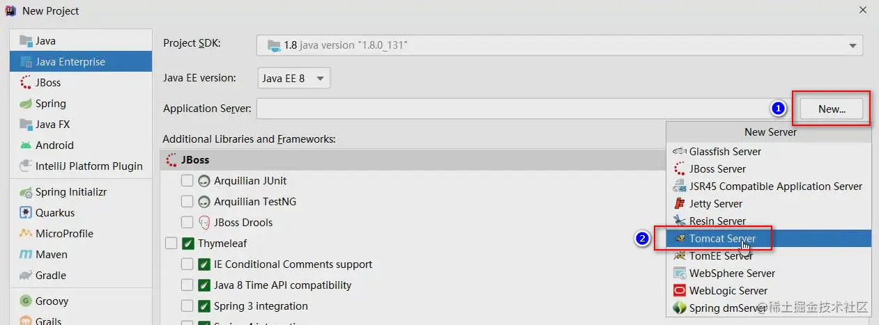 在New Project对话框的左侧选择Java Enterprice,在右侧确保Project SDK是1.8版本,Java EE version为Java EE 8(也可以是略低的其它版本):