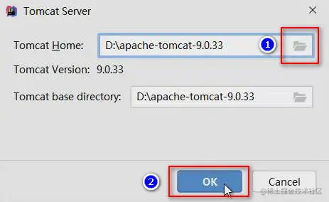在弹出的Tomcat Server对话框中,在Tomcat Home栏浏览到第1步下载的Tomcat目录,并点击OK: