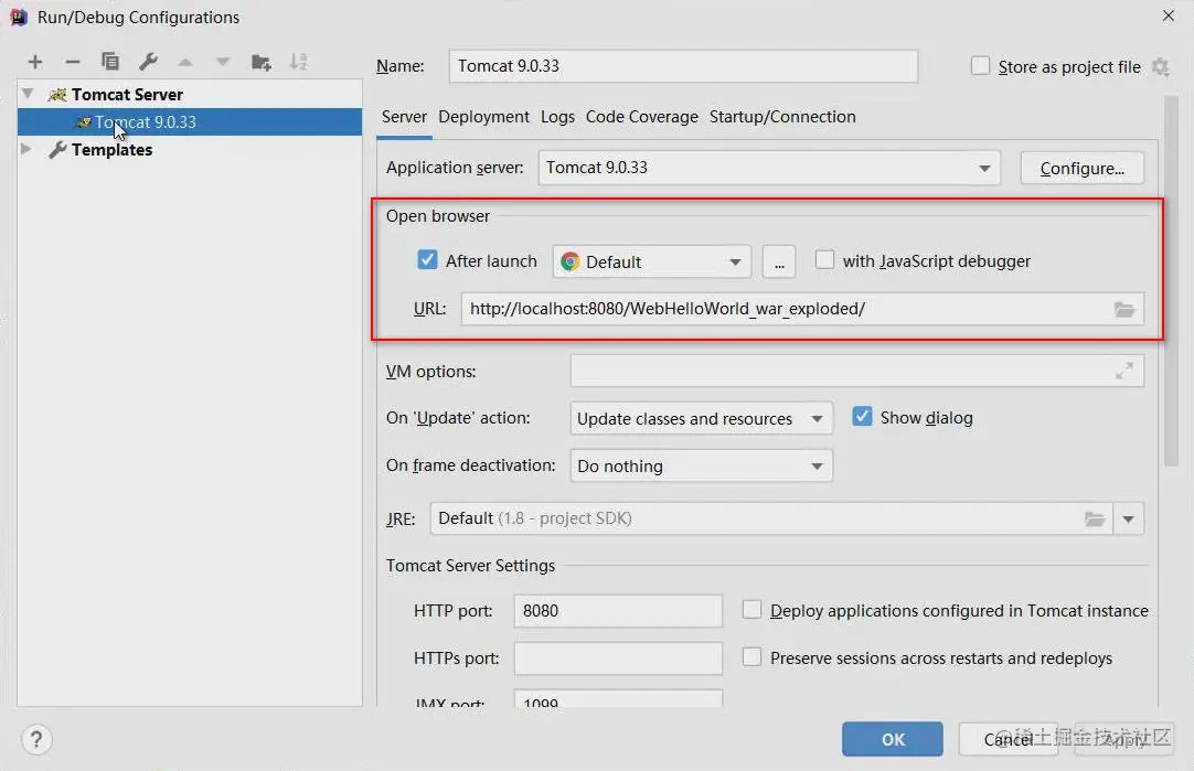 在设置面板中,有Open Browser(打开浏览器)设置项,在下方默认勾选了After launch(启动之后)、所使用的浏览器,及打开浏览器后访问的URL:
