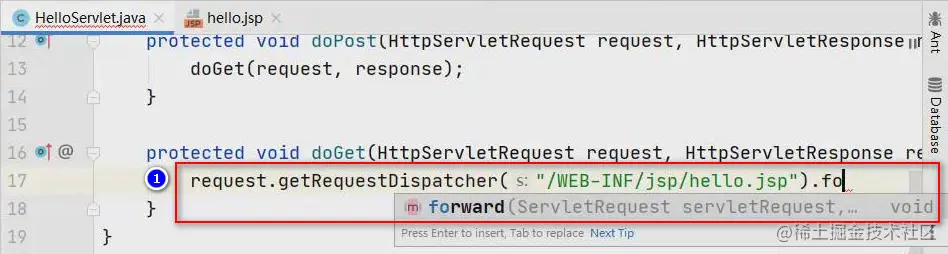 回到Servlet类的doGet方法中,添加转发JSP的代码,例如: