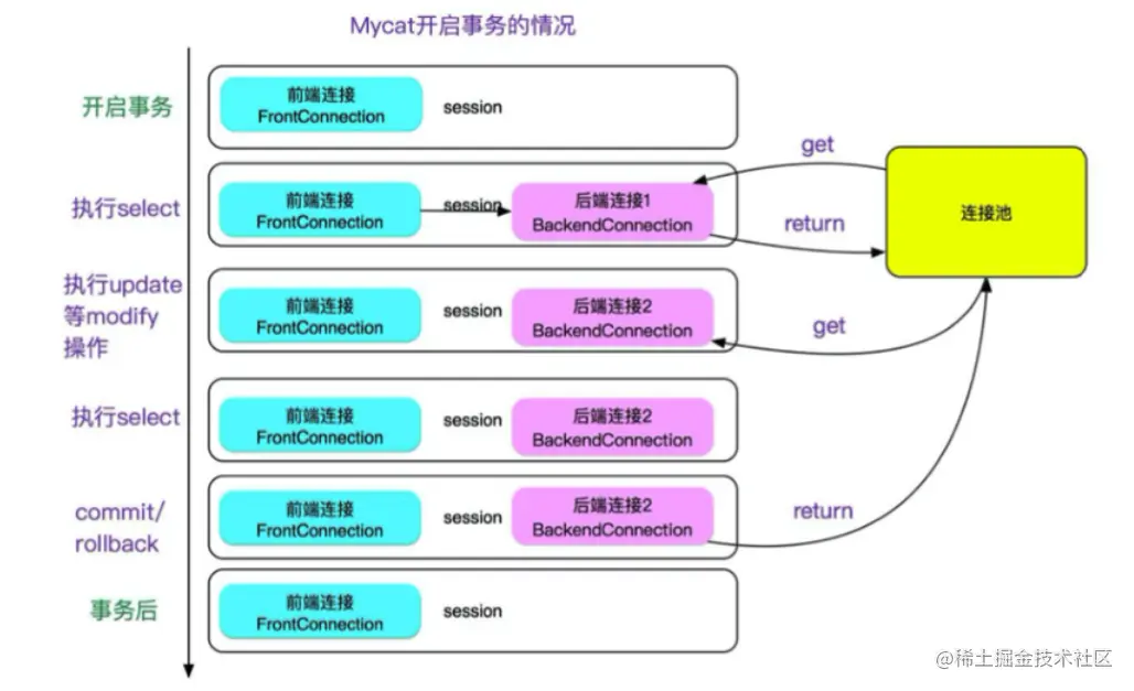 mycat 有一个特性,就是开事务之后,如果不运行 update/delete/select for update 等更新类语句SQL 的话,不会将当前连接与当前 session 绑定。如下图所示: