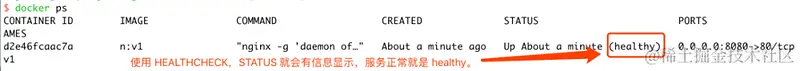 启动后,HEALTHCHECK 就会5秒钟访问一次 Nginx 服务,来确保容器运行的状态。\