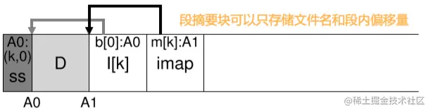 因此问题就落在了怎样检测哪些块是可覆盖的,而哪些是不可覆盖的。我们再次添加一个间接结构,在每个段的头部添加一个segment summary block,用于记录段中每个数据块D,inode号(它属于哪个文件)和它的偏移量(它是文件的哪个块)。如果想查看一个块是否可覆盖,就只需要在正常的查找过程中添加一个和segment summary block,进行一次验证。
