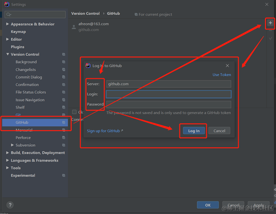 在IDEA中设置GitHub,File-->Setting->Version Control-->GibHub-->+