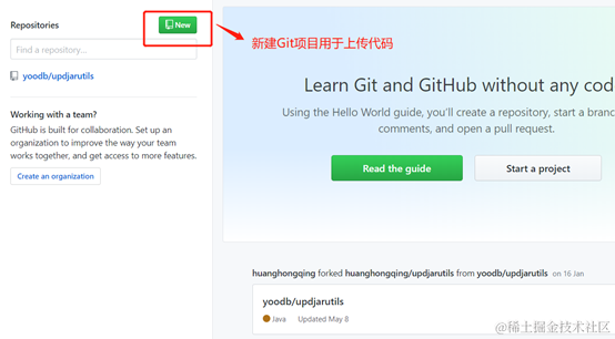 在GitHub中创建一个账号,小编这里就跳过此步骤了。(只需创建账号,无需在GitHub上创建仓库),登录成功后。打开https://github.com/地址,选择New按钮,创建项目,如图所示: