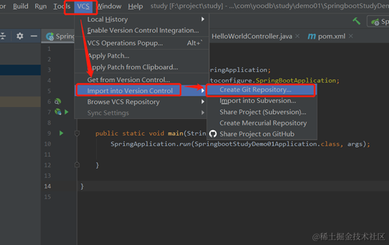 第一步,创建本地仓库,VCS-->Import into Version Control-->Create Git Repository...,如图所示: