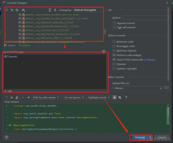 第三步,选中项目右键Git--> Commit Directory,在弹窗中输入Commit Message,点击commit,此时项目文件从暂存区真正进入版本库中,项目文件变成白色,如图所示: