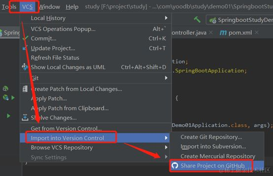 上传项目到GitHub中,VCS-->Import into Version Control-->Share Project on GitHub,如图所示: