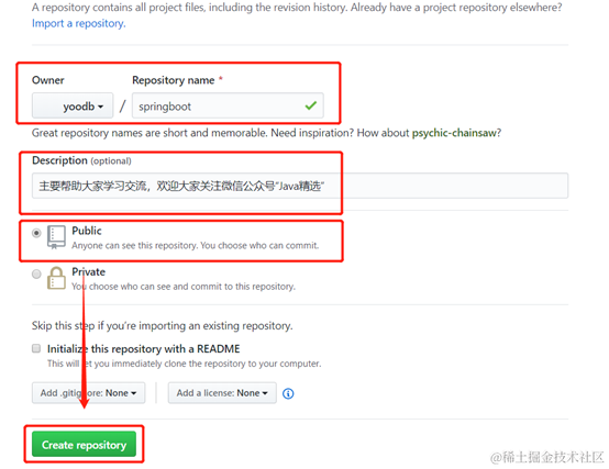 Owner:所有人; Repository name:仓库名称; Description:描述; Public:说明(可选)