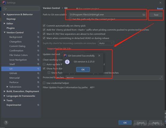 在IntelliJ IDEA中设置Git程序,在File-->Setting->Version Control-->Git-->Path to Git executable选择你的Git安装后的git.exe文件,然后点击Test,测试是否设置成功,如图所示: