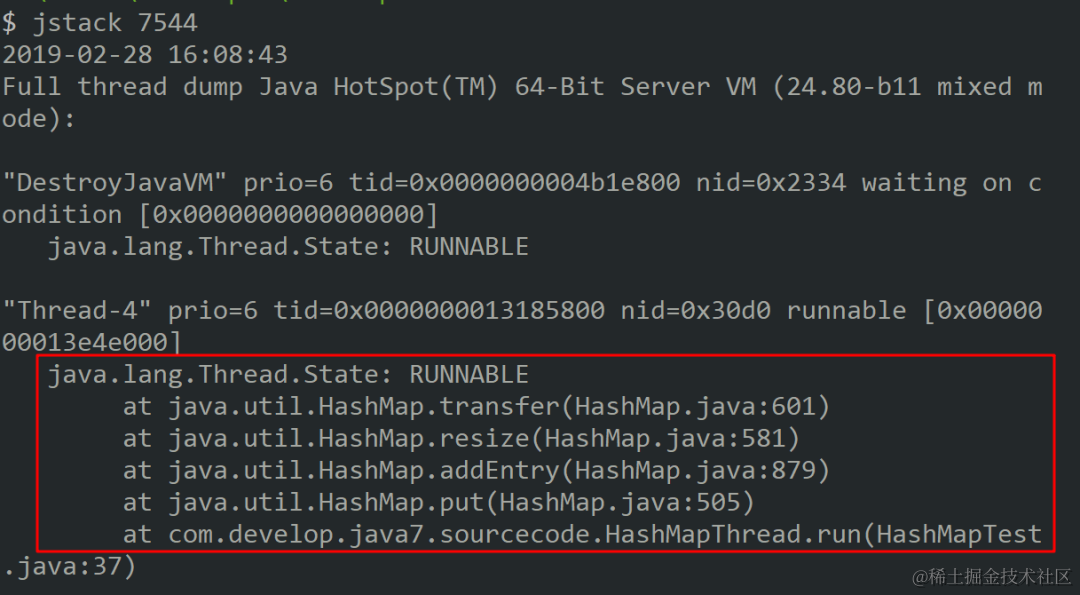这里我们着重分析为什么会出现死循环的情况,通过jps和jstack命名查看死循环情况,结果如下: