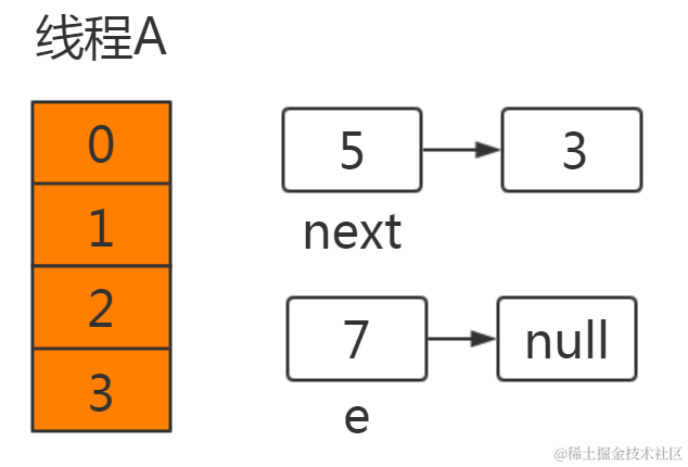 此时切换到线程A上,在线程A挂起时内存中值如下:e=3,next=7,newTable[3]=null,代码执行过程如下: