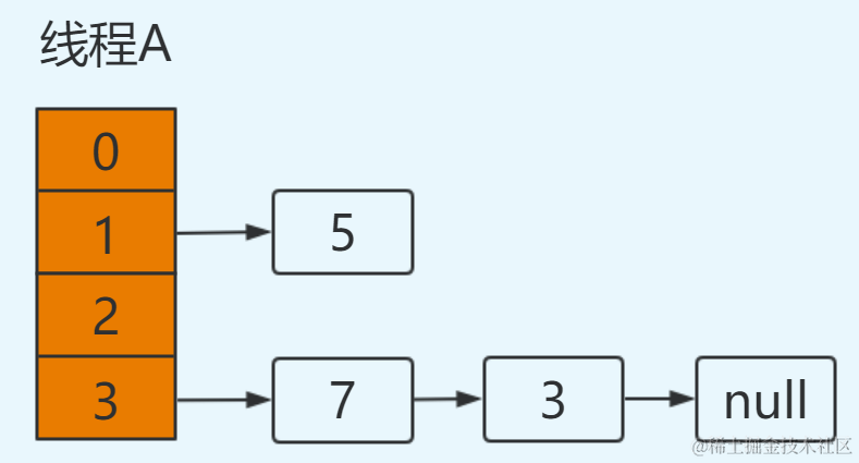 此时切换到线程A,在线程A挂起时:e=7,next=5,newTable[3]=null。